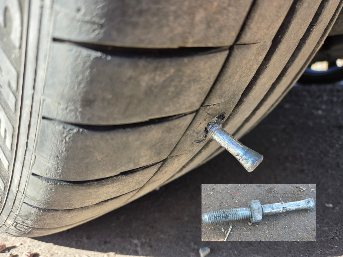 Pidän aina autossa renkaanpaikkaussarjaa ja kompressoria, ja onpa tuota tullut käytettyäkin muutaman kerran, omien ja vieraiden renkaiden paikkaamiseen. Tällä kertaa mökkitiellä meni kumista läpi hillitön pultti, osa kiila-ankkurista, vielä muutterikin mukana. Kesti aikansa vääntää pitkillä putkipihdeillä se irti, mutteri otti vastaan ankarasti. Olisi ehkä saanut pyöriteltyä irti, mutta kun sitäkään ei nähnyt mitä siellä sisällä oli, ennenkuin sai ulos.