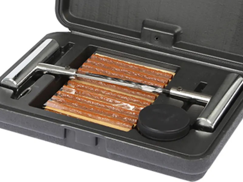 Minulla siis on aina mukana autonrenkaan paikkasarja. Tällainen hyvä sarja, esimerkiksi Motonetin tuote 60-2009 ”TipTop Tubeless paikkaussarja”, maksaa 30 € ja siinä on hyvät kahvalliset raspi ja neula. Tai MTX:n 6 € sarjassakin on kohtalaisen näköiset kahvat. Kompressori on rengaspaineiden säätöön kelin, lämpötilan ja ajotehtävän mukaan myös aina kiva olla mukana. Perinteiset halvemmat tupakansytytinliitännästä virtansa ottavat ovat pieniä ja kevyitä olla mukana. Akulla toimivat ovat kuitenkin vieläkin käytännöllisemmät, kun ei tarvitse pitkän johdon kanssa pelata. Itsellä kulkee Makitan akkukompressori mukana.